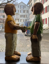 Menschenfiguren, die auf blauen Erdbällen oder riesenhaften Schrauben stehen und in die Ferne blicken, die Autos unter dem Arm tragen, oder auf Kirchen hocken. Die typisierten Figuren von Daniel Wagenblast (* 1963, Schwäbisch Gmünd) entstehen in diversen Größen – aus Materialien wir Holz, Bronze oder Aluminium.
