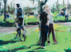 Wie durch einen Spiegel hält Alireza Varzandeh ( * 1963) dem Betrachter seiner Arbeiten das alltägliche Leben, gesellschaftliche Strukturen und Gewohnheiten vor Augen: Von ausgelassenen Strandszenen über Passanten und Radfahrer im Stadtverkehr, Spaziergänger im Park bis hin zu farbenprächtigen Blumenstillleben. Durch die weitreichende Farbpalette, die gezielt gesetzten Schattierungen, Reflektionen sowie Lichtakzente wird der Beobachter spontan und direkt ins Bildgeschehen hineingezogen